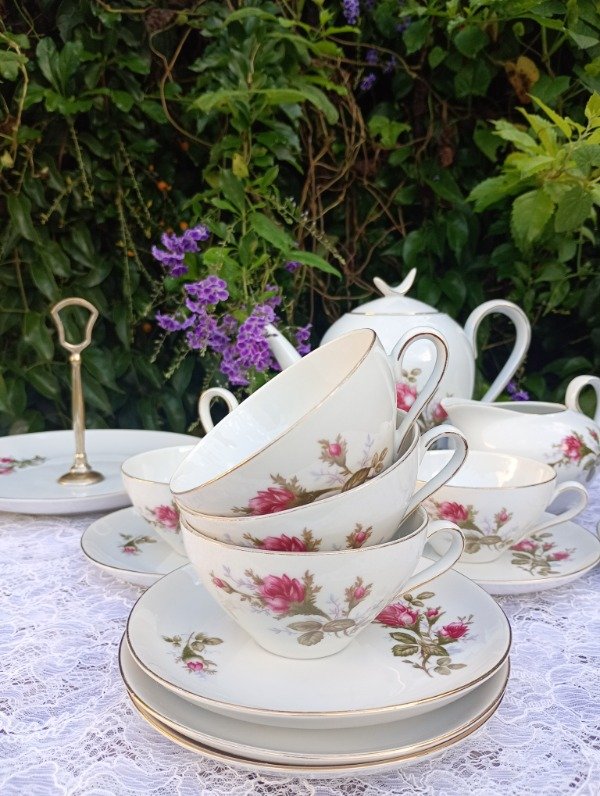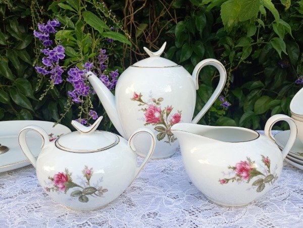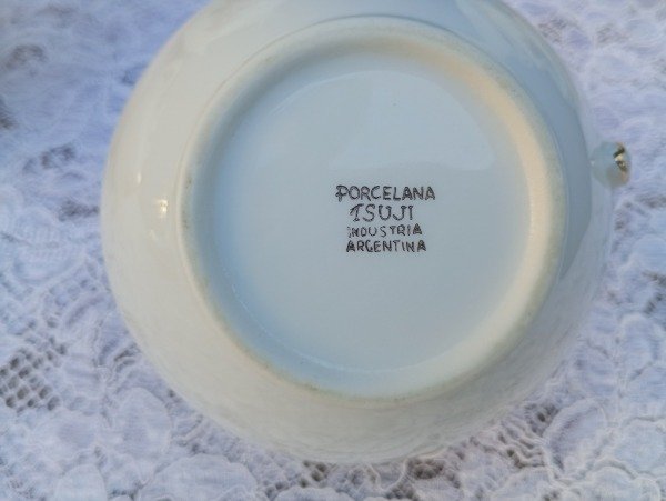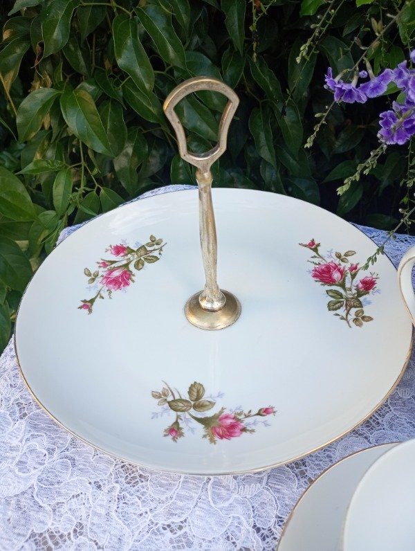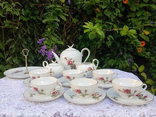 Incluye tetera, azucarera, lechera, 6 dúos de café y plato de masas. El agarre del plato masitero tiene desgaste del baño de plata.